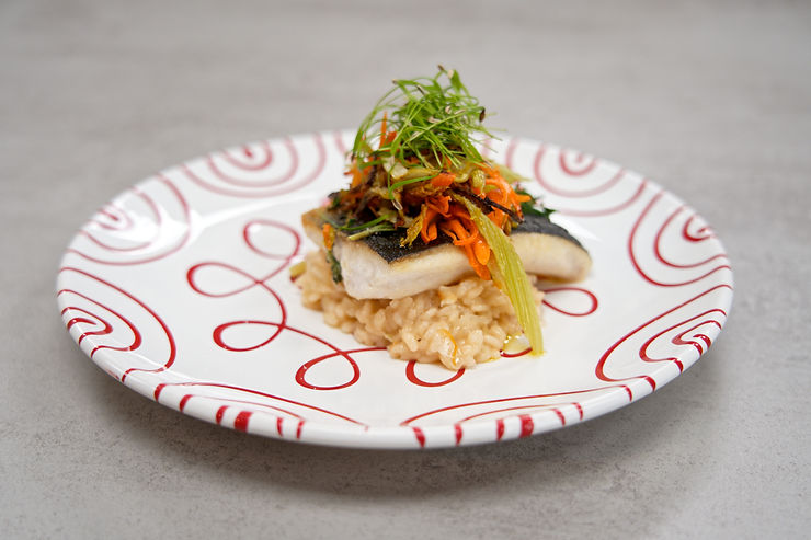 5. Zum Schluss den Erdäpfel-Endiviensalat mittig auf einem flachen Teller anrichten, die Radieschen halbieren und darauflegen und den Fisch dazugeben. Das Gericht mit etwas Meersalz und ein wenig Kürbiskernöl garnieren.
