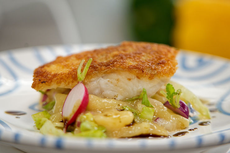 4. Die panierten Filets nun in einer beschichteten Pfanne nur auf der Brösel-Seite in Olivenöl anbraten. Nach etwa einer Minute die Butter dazugeben und weiterbraten, bis er knusprig ist. Den Fisch bevor er fast fertig ist wenden, direkt herausnehmen und auf einem Stück Küchenpapier abtropfen lassen.