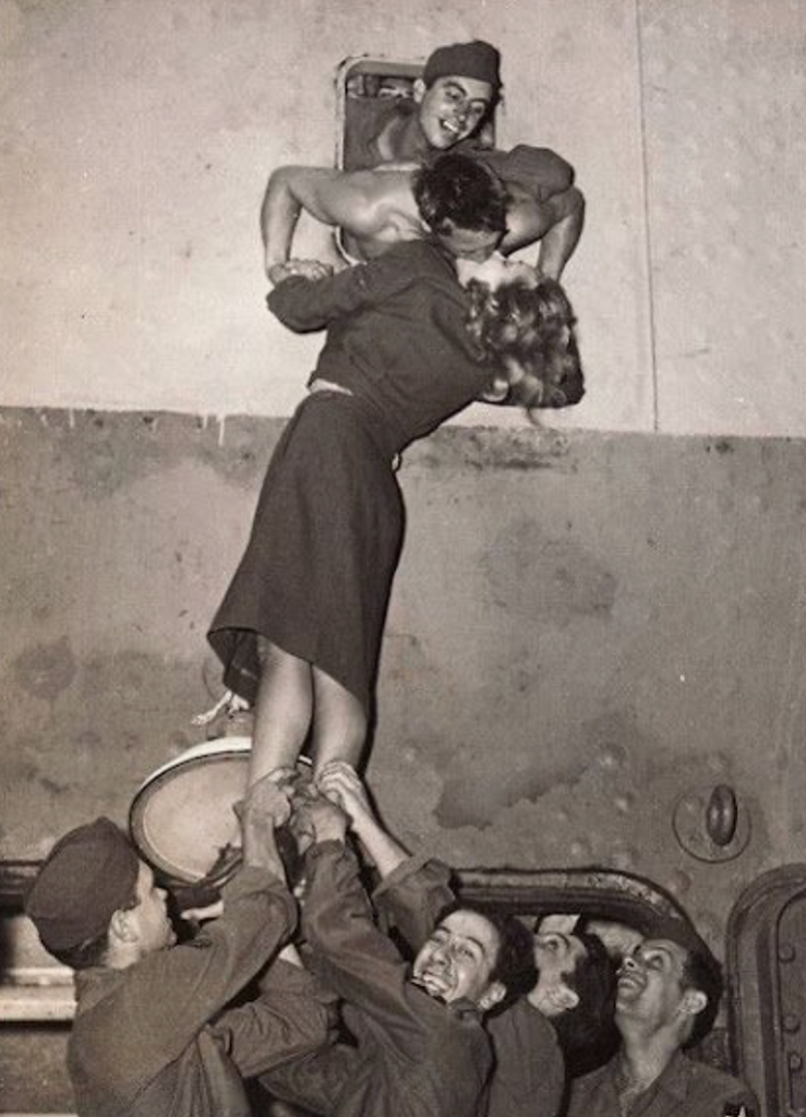 as auf dem Foto ist Marlene Dietrich bei einem ihrer Frontbesuche. Man kann ihr vollen Einsatz bei der Arbeit nicht absprechen. Strafft die Core Muskulatur und bestimmt ein paar andere Sachen auch noch… 😉