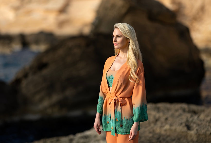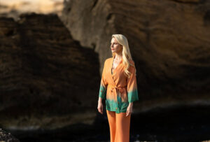 Diese Mermaid kann’s auch andersrum! Hier liegt die Betonung auf Koralle, mit grün schimmerndem Seegras, das am Jackensaum und Hosenbein emporwächst. Macht dieser Dreiteiler nicht Lust auf einen Tequila Sunrise mit Blick aufs Meer?