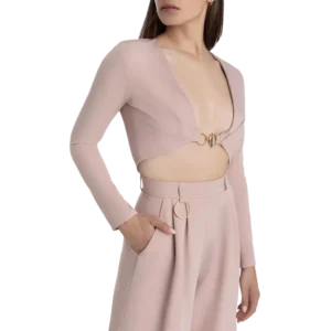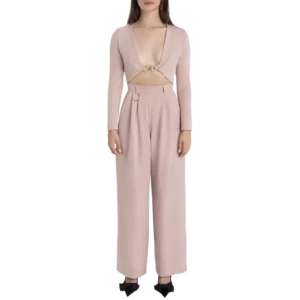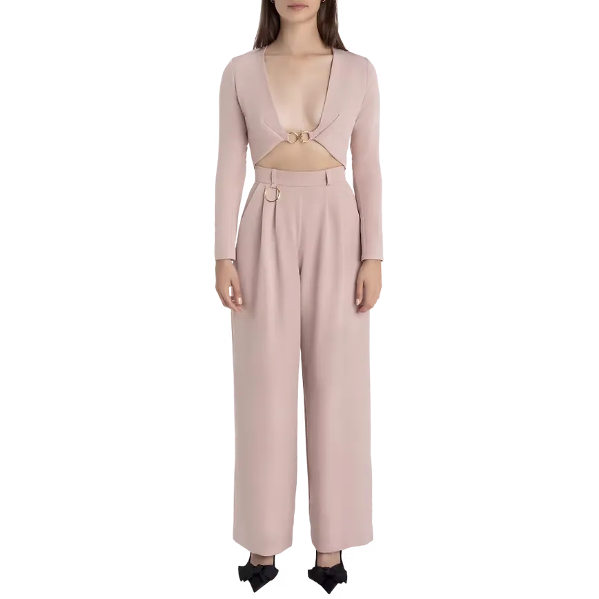 Unser rosé Zweiteiler mit weiter Anzughose und bauchfreiem Bolero mit Goldschließe vereint Eleganz und Modernität in einem atemberaubenden Look. Perfekt für stilbewusste wie auch selbstbewusste Trendsetterinnen, die mit ihrem Outfit ein Statement setzen wollen.