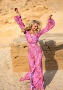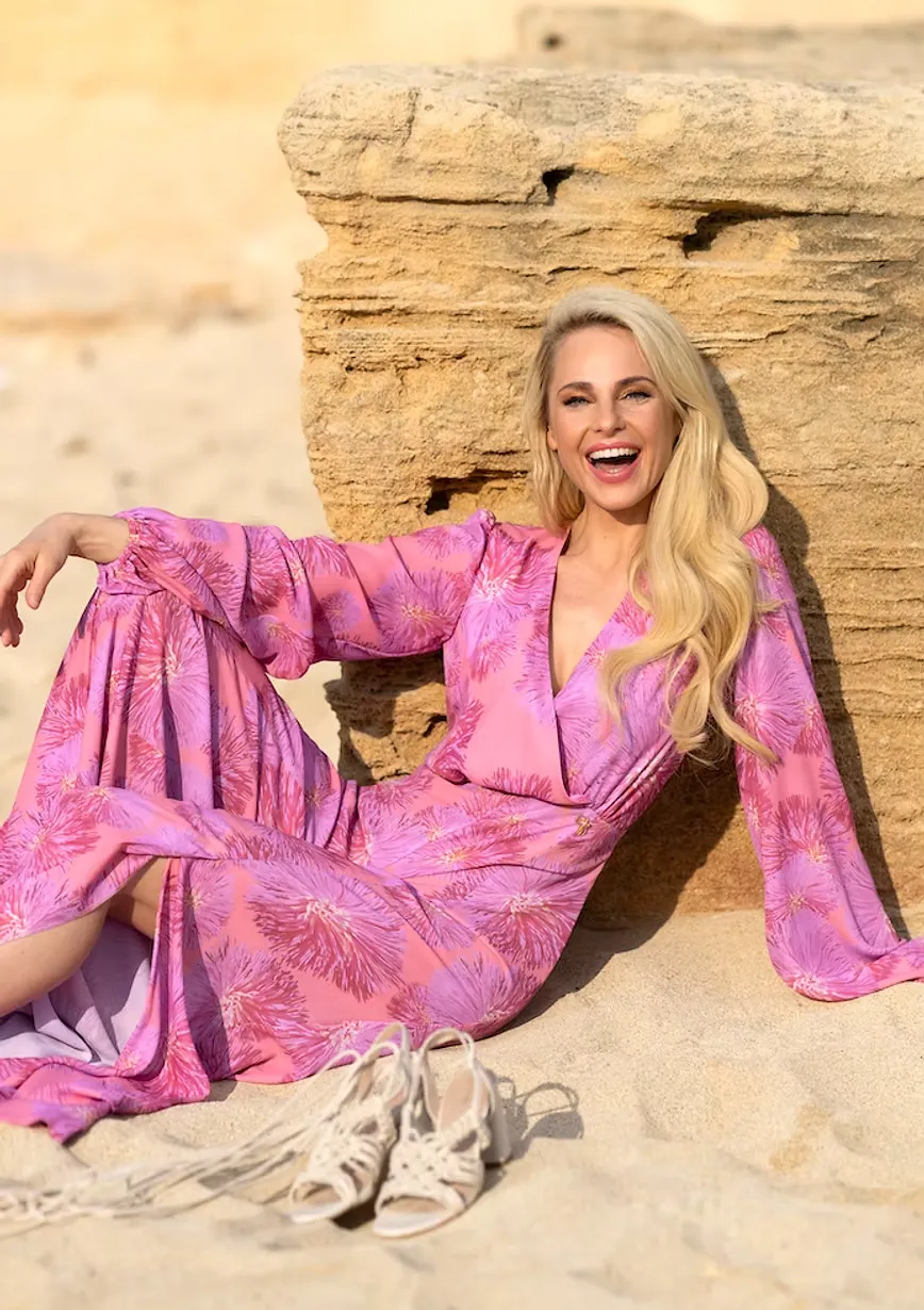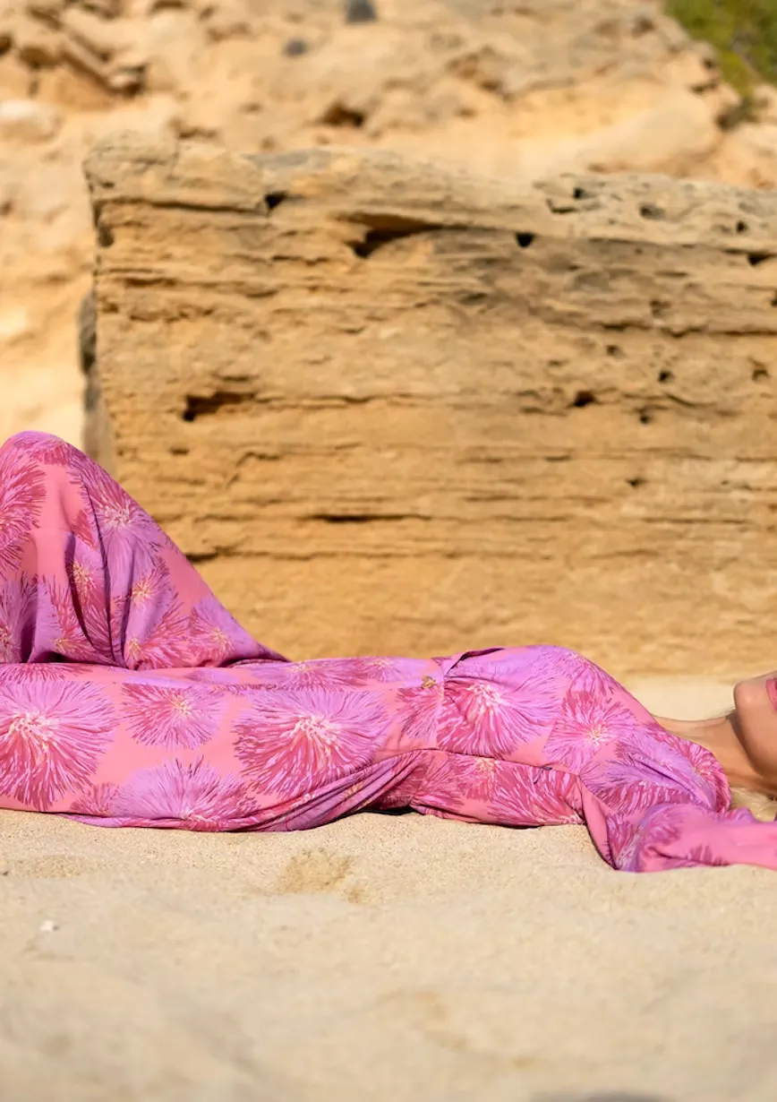 Herrlich fürs Auge und mindestens ebenso herrlich zur Haut ist dieser floral-corale Traum von einem Jumpsuit, bei dem der fließende pinke Stoff wie eine Meeresbrise um die Beine streicht. Ein raffiniert taillierter und dekolletierter Einteiler, mit dem jede Dame gern auch länger an der Beachbar strandet.
