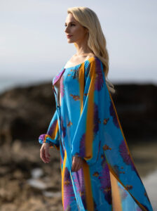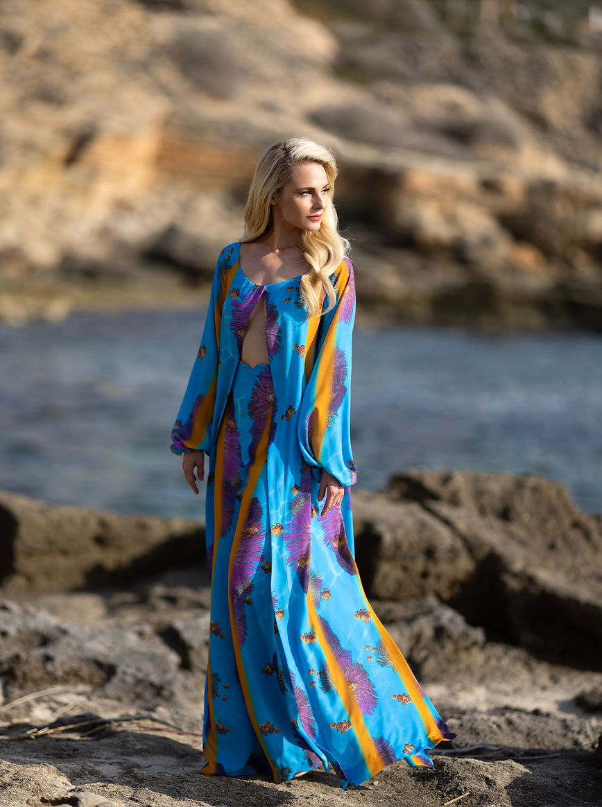 König Triton, Herrscher über das Meeresreich Atlantica und Vater der Meerjungfrau Arielle, stand Pate für diesen prachtvollen Zweiteiler. Blau, violett, orange: In den großzügigen Silhouetten von Cape und Hose spiegelt sich die ganze submarine Farbwelt wider. Anschmiegsam, atemberaubend, außergewöhnlich!