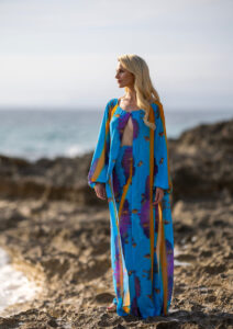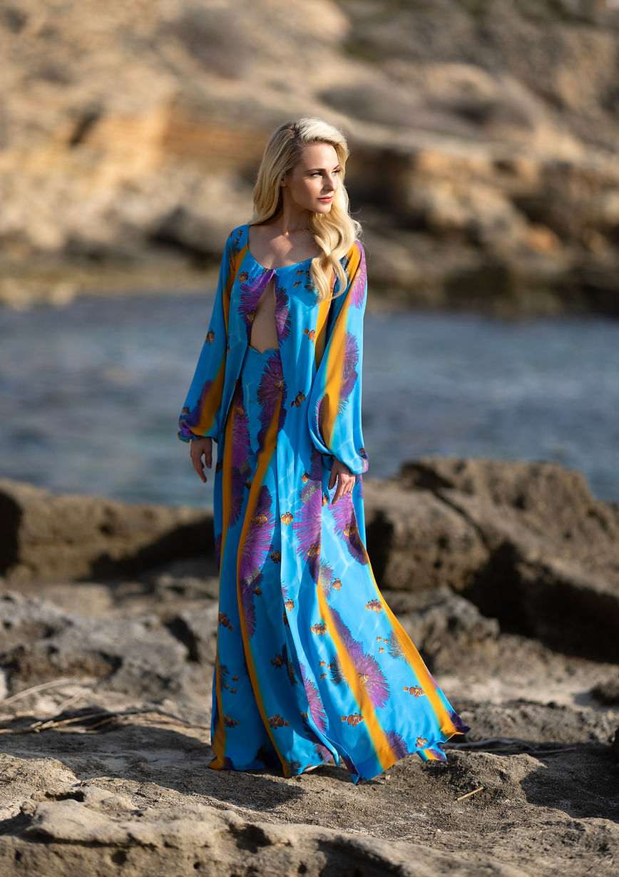 König Triton, Herrscher über das Meeresreich Atlantica und Vater der Meerjungfrau Arielle, stand Pate für diesen prachtvollen Zweiteiler. Blau, violett, orange: In den großzügigen Silhouetten von Cape und Hose spiegelt sich die ganze submarine Farbwelt wider. Anschmiegsam, atemberaubend, außergewöhnlich!