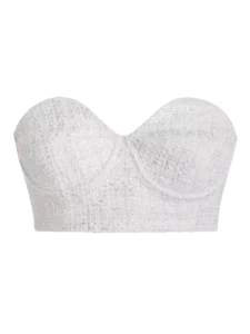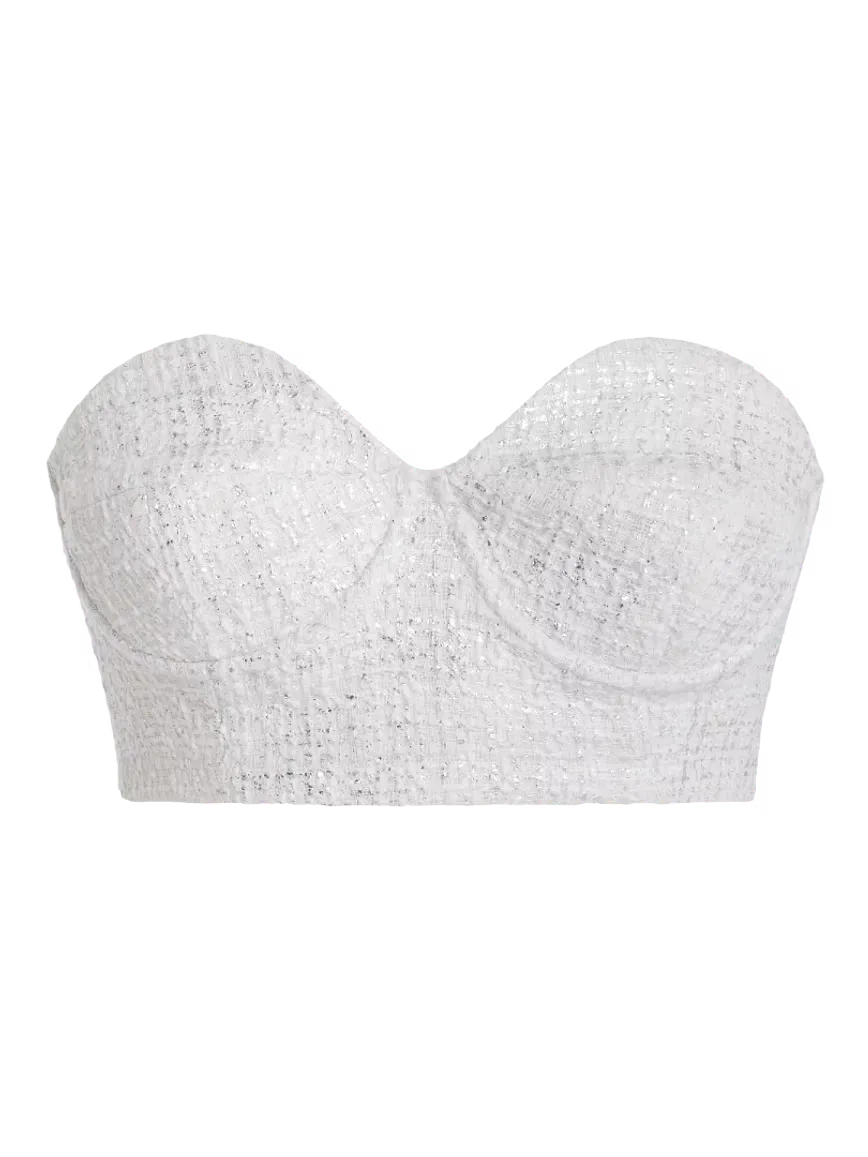 Das Bustier aus Bouclé in Weiß und Silber betont gekonnt dein Dekolleté und verleiht dir einen eleganten, femininen Look. Die luxuriöse Textur und das stilvolle Design machen dieses Bustier zu einem echten Hingucker unter einem Jackett oder solo.