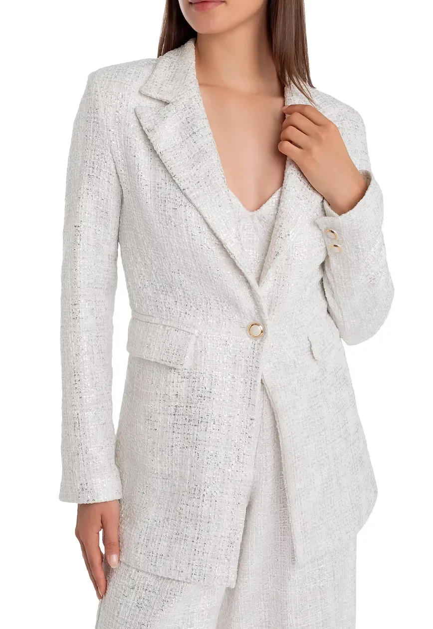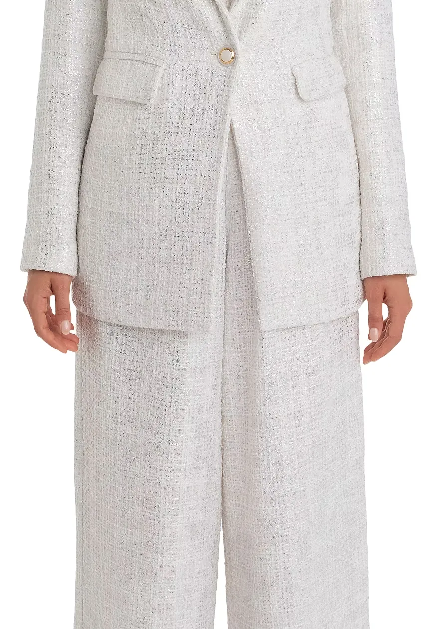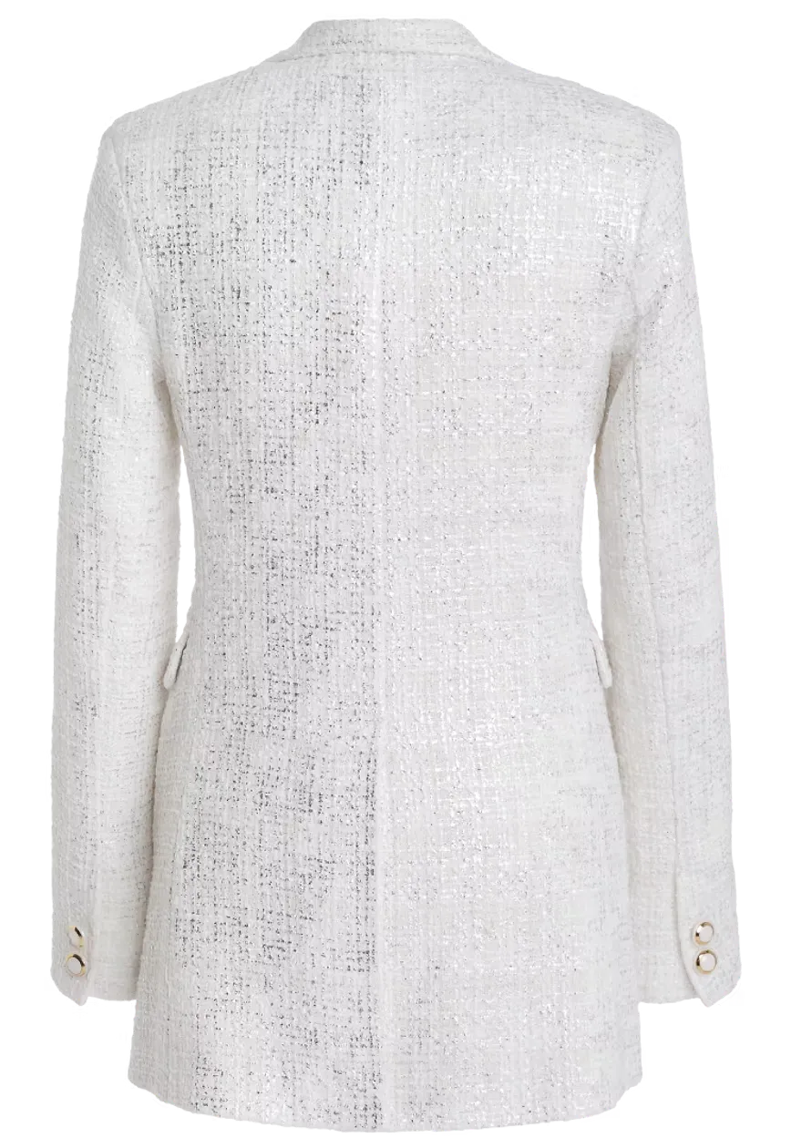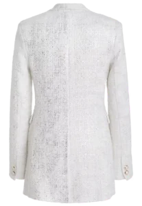 Unsere Bouclé-Jackett in Weiß und Silber vereint modernen Stil mit luxuriöser Eleganz. Das hochwertige Bouclé-Gewebe sorgt für einen einzigartigen Look, der sowohl casual als auch chic kombiniert werden kann. Jackie O. would love it….