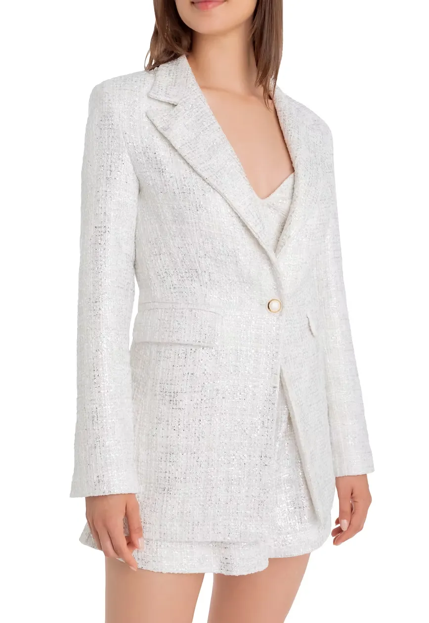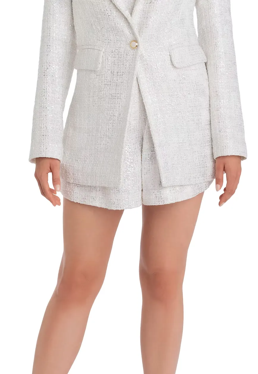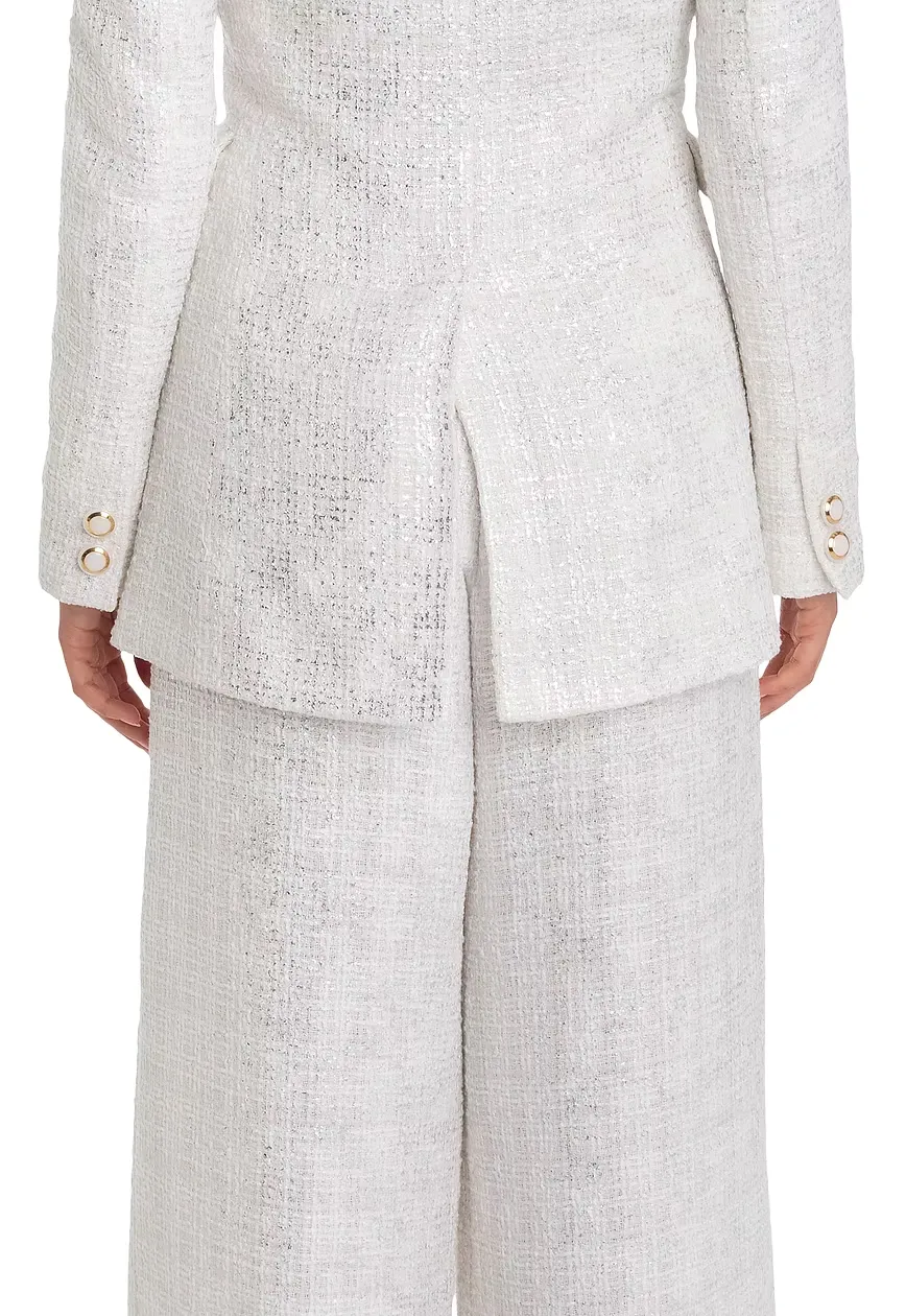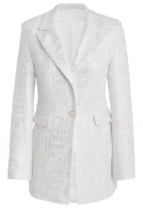 Unsere Bouclé-Jackett in Weiß und Silber vereint modernen Stil mit luxuriöser Eleganz. Das hochwertige Bouclé-Gewebe sorgt für einen einzigartigen Look, der sowohl casual als auch chic kombiniert werden kann. Jackie O. would love it….