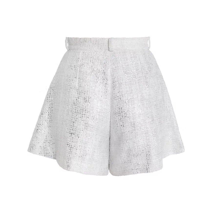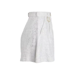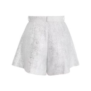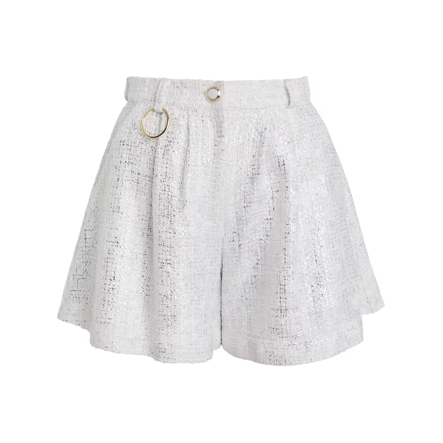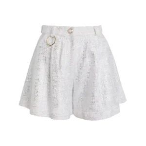 Unsere weiß-silberne Short in Bouclé besticht durch ihre edle Optik und den luxuriösen goldenen Ring, der jedem Outfit einen Hauch von Raffinesse verleiht. Perfekt für sexy Looks, kombiniert diese Short stilvolles Design mit höchstem Tragekomfort.